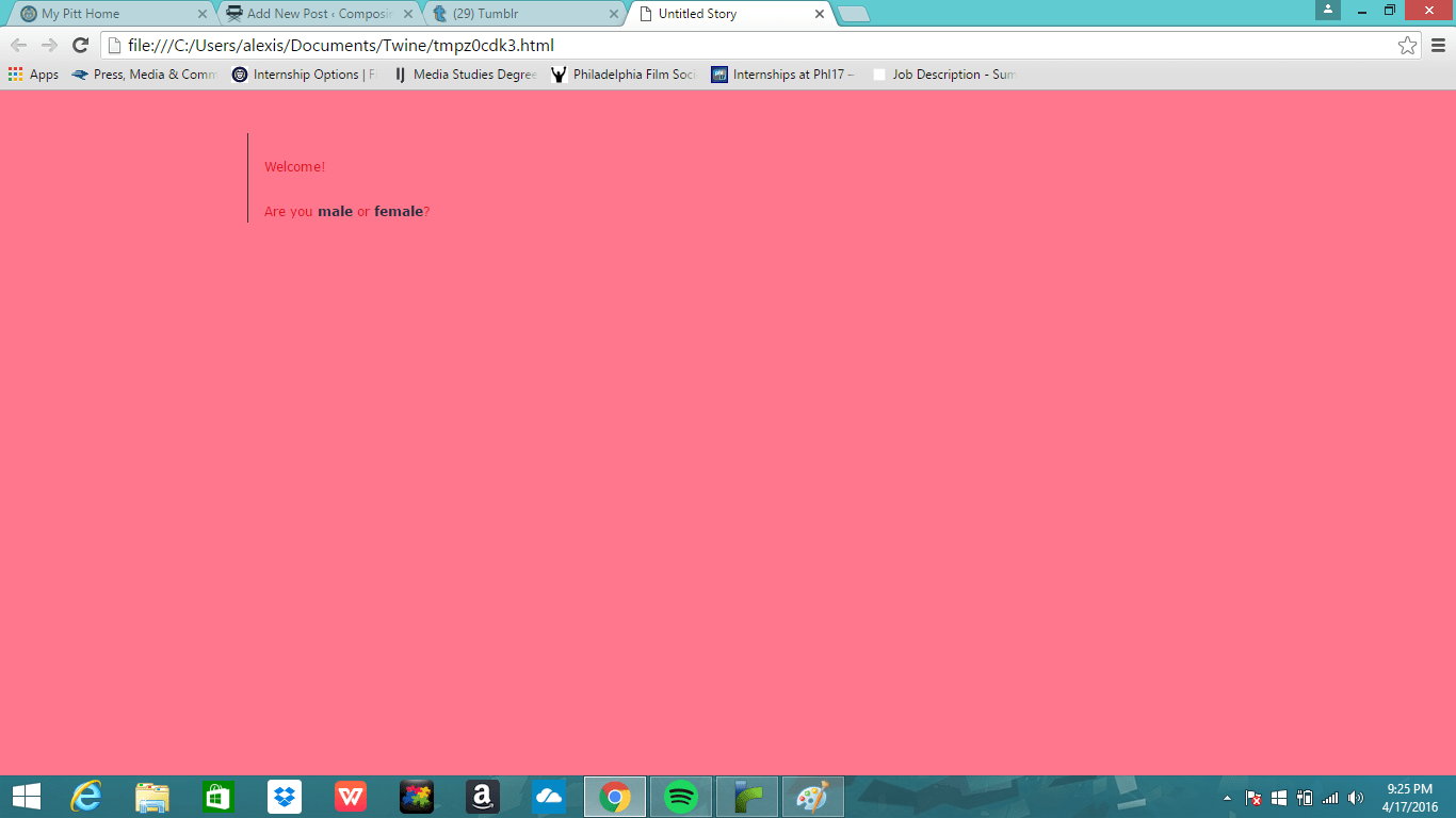 When I code or do anything that requires building, I have to be actively organized. I need a non-dynamic flow for my thoughts and produced work so I can revisit for either review or looking back to regain a thought stream. I noticed many students while making Twines had the passage boxes all over the screen in clusters. If I were someone reviewing the work, this lack of organization would drive me up a wall.